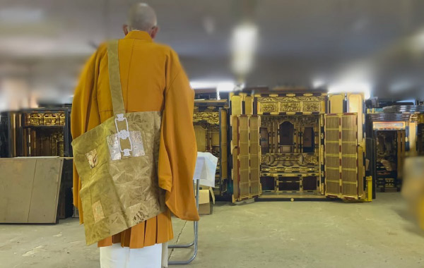 引き取らせていただいたお仏壇は、すぐに処分するのではなく、自社の保管倉庫にで大切に保管します。 そして月に1度、提携寺院のご住職をお招きし、合同での読経・供養(魂抜き)を執り行っています。